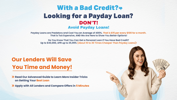 Many people online routinely type in the phrase “where can I find the best $255 payday loans online same day approval no credit check” or other variations into Google. However, uninformed borrowers can make a mistake by signing a loan agreement from a predatory lending company offering sky-high interest rates with 400%+ APRs and inflexible terms. Don’t worry. Our lenders are here to help. They offer personal loans for bad credit. Now you can get up to $40,000, on APR up to 35,99%. Apply with all lenders below and compare offers in minutes.